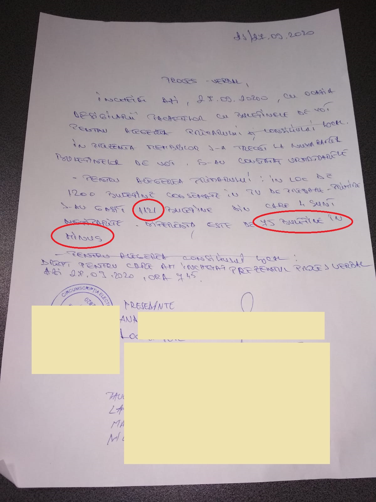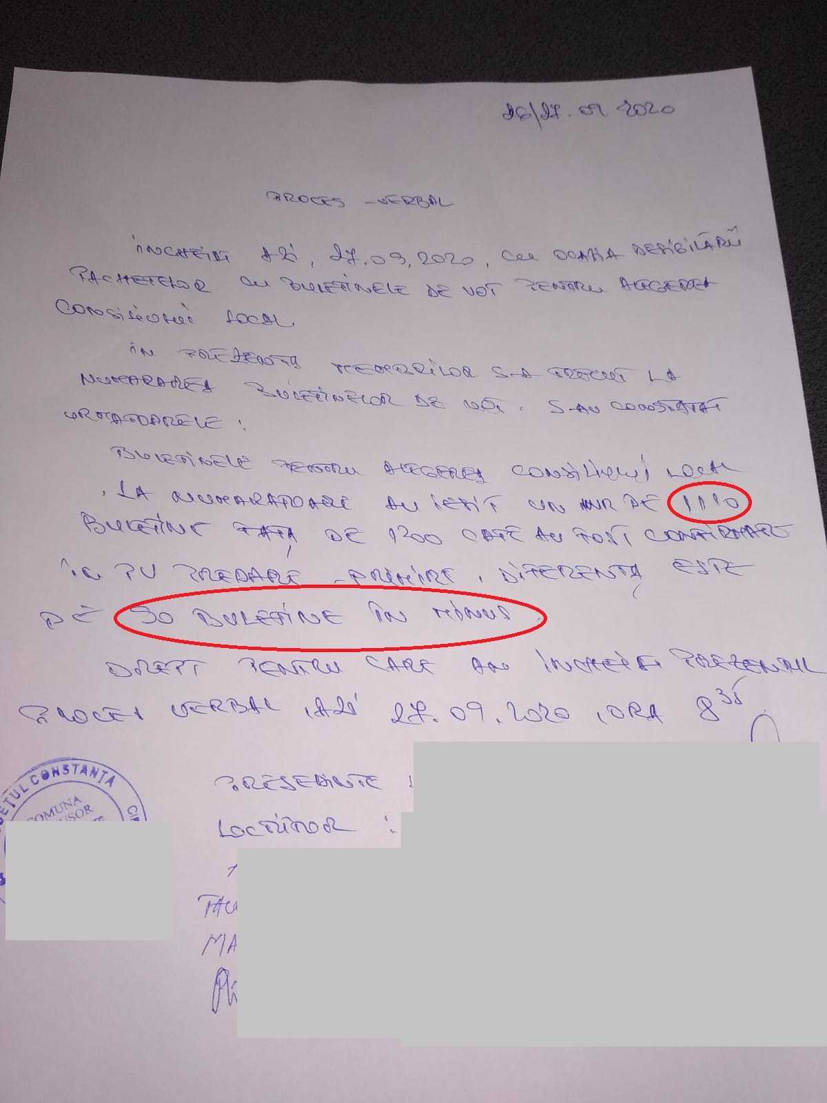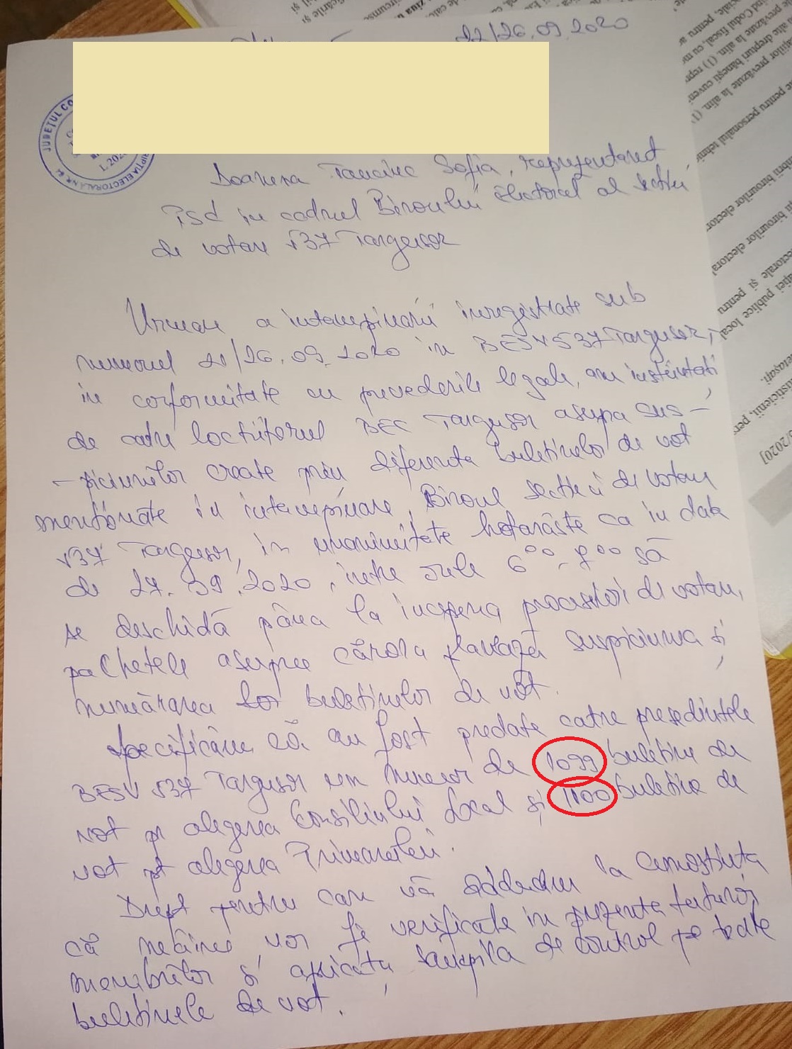 Reprezentanta PSD a făcut o întâmpinare pe această temă către Biroul Electoral al secției de votare, la care i s-a răspuns că au fost primite doar 1099 de buletine pentru Consiliul Local și 1100 pentru primar și că s-a decis numărarea exactă a buletinelor pe 27 septembrie, înainte de începerea procesului de votare.