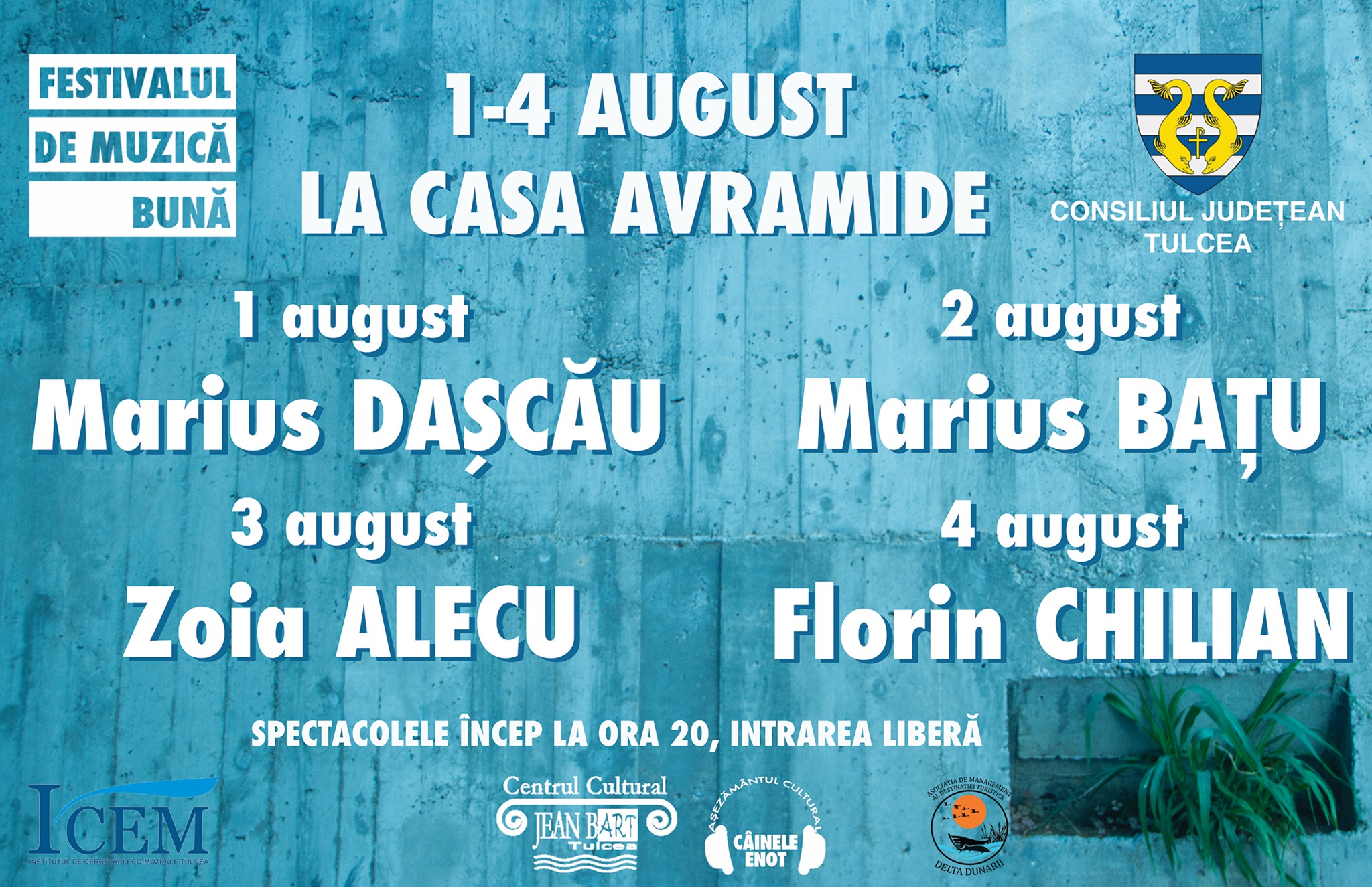 Luna începe în curtea Casei Avramide, din municipiul Tulcea, cu Festivalul de Muzică Bună. Timp de patru zile, de pe 1 până pe 4 august, tulcenii se vor bucura de recitaluri de folk de cea mai bună calitate. Pe 1 august va concerta Marius Dașcău, pe 2 august Marius Bațu, pe 3 august Zoia Alecu, iar pe 4 august Florin Chilian.
