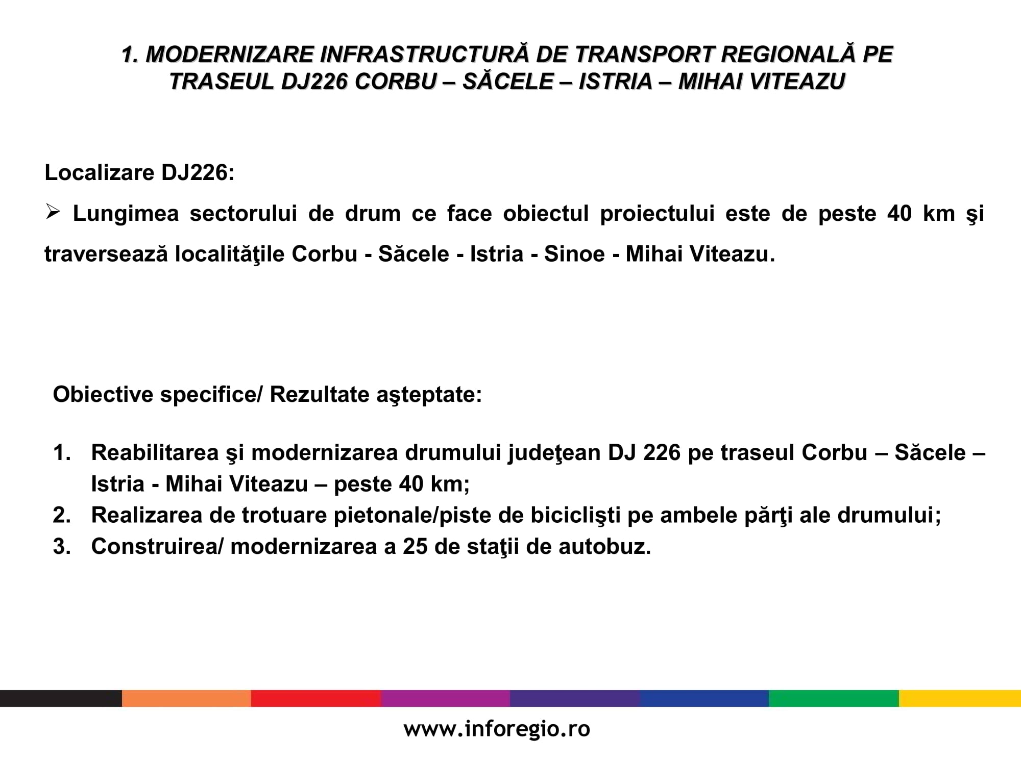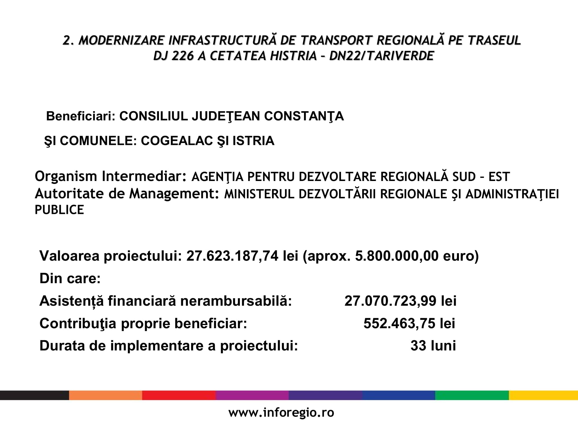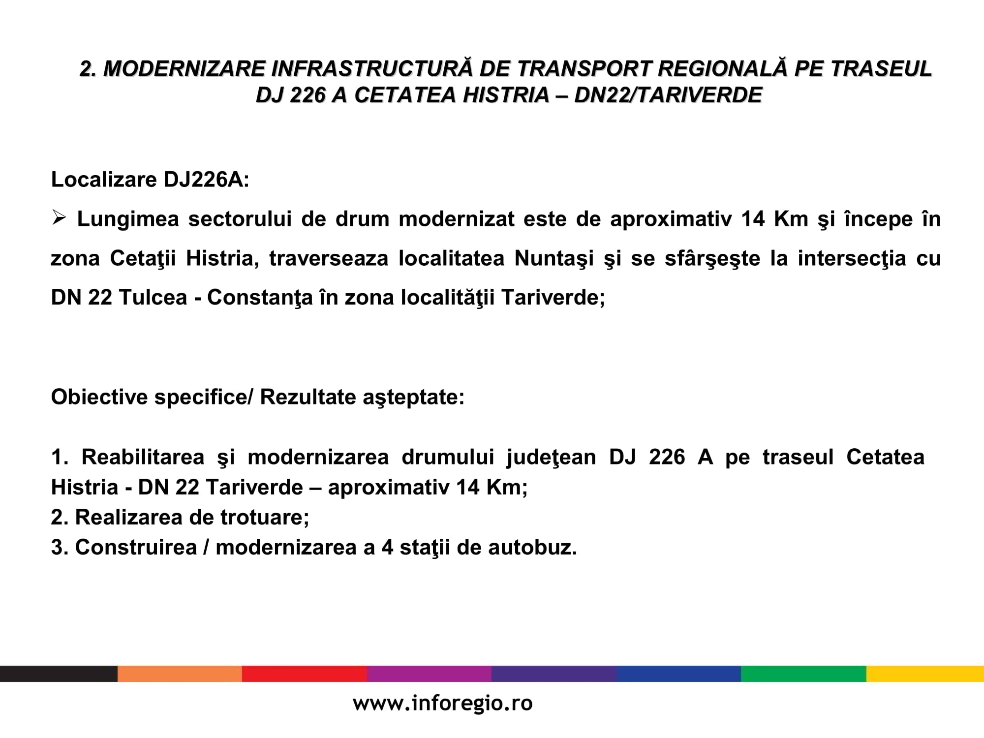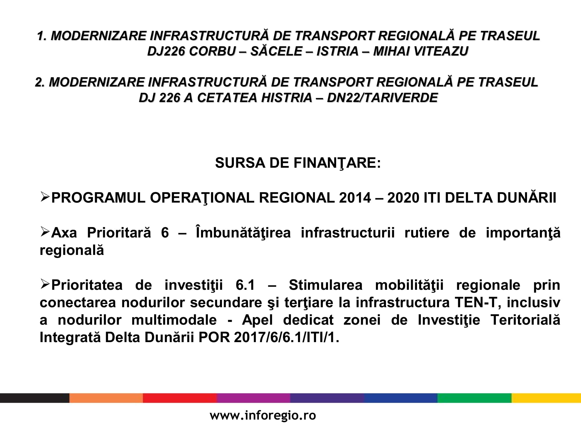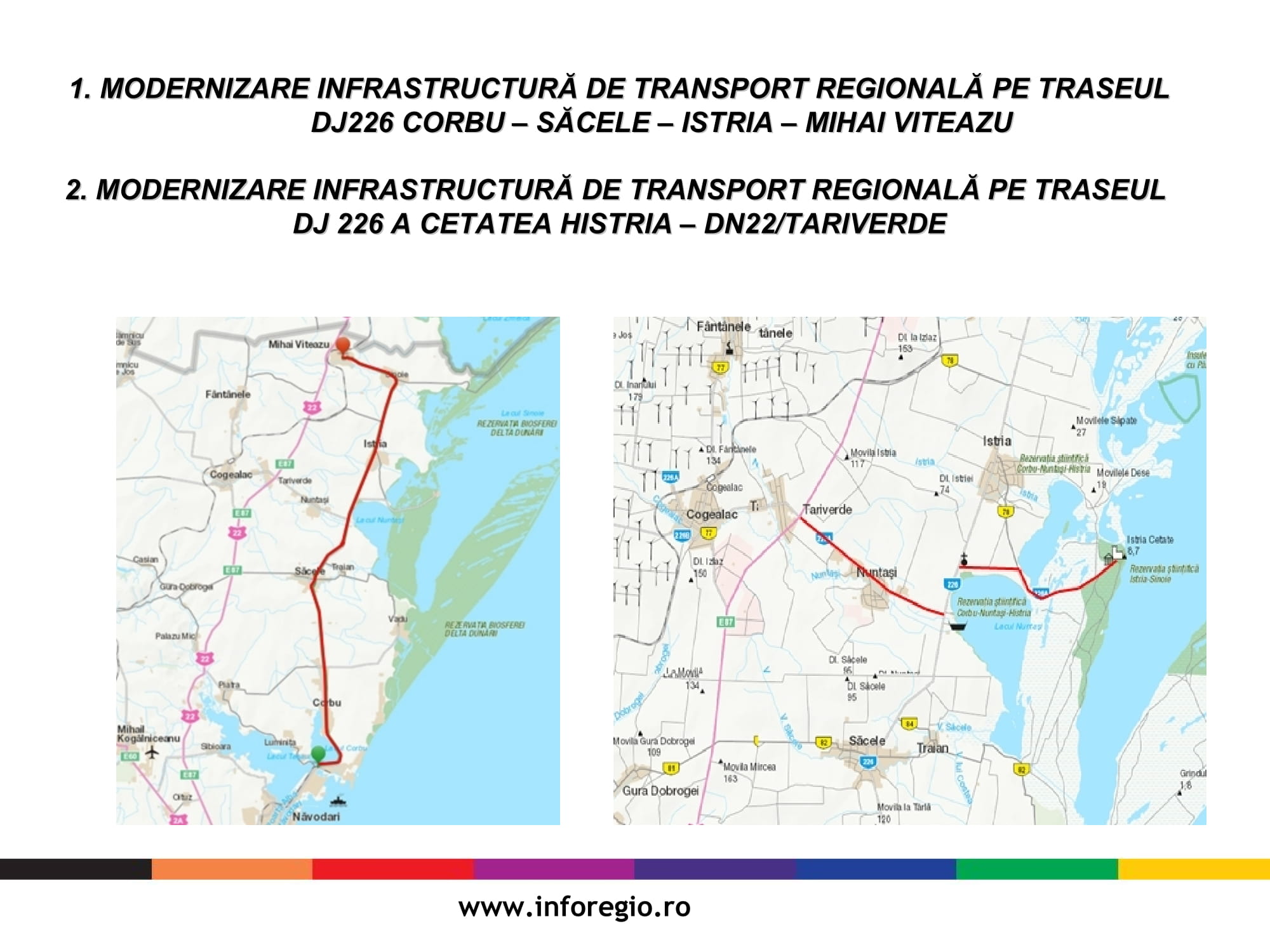 Proiectele semnate care vizează infrastructura vor fi finanțate prin Programul Operațional Regional 2014-2020 ITI Delta Dunării iar valoarea totală a acestora este de 23 de milioane de euro și respectiv 5.8 milioane de euro. Durata de implementare a celor două proiecte este de 44 luni și respectiv 33 luni de la emiterea ordinului de începere pentru execuția de lucrări. Obiectivele specifice proiectelor vizează reabilitarea și modernizarea drumurilor pe o lungime de 40 de km, respectiv 14 km și constau în lucrări de reabilitare și modernizare a structurii rutiere, lucrări de poduri, creșterea siguranței rutiere și amenajarea intersecțiilor și drumurilor laterale.