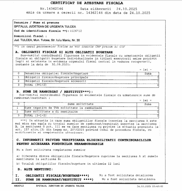 Conform Certificatului de atestare fiscală nr. 14362146 din 24 octombrie 2025, Spitalul Județean de Urgență Tulcea nu are obligații fiscale, nici alte obligații bugetare.