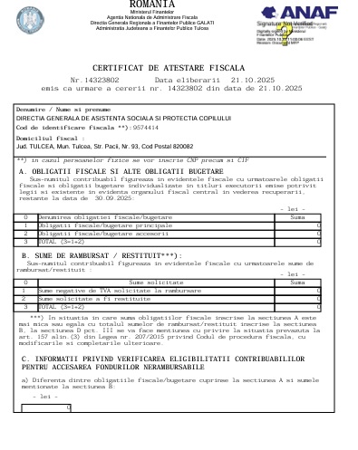 Conform Certificatului de atestare fiscală nr. 14323802 din 24 octombrie 2025, Direcția Generală de Asistență Socială și Protecția Copilului Tulcea nu înregistrează obligații fiscale sau alte obligații bugetare.