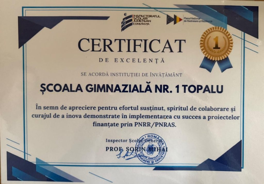 În semn de recunoaștere pentru implicarea constantă și profesionalismul cadrelor didactice, unitatea de învățământ a fost onorată cu Certificatul de Excelență. Distincția se acordă pentru efortul susținut, colaborarea eficientă și spiritul inovator demonstrat în implementarea proiectului „Eduscop”, finanțat prin PNRAS, evidențiind devotamentul întregii comunități școlare în crearea unui mediu educațional stimulativ și pozitiv.”