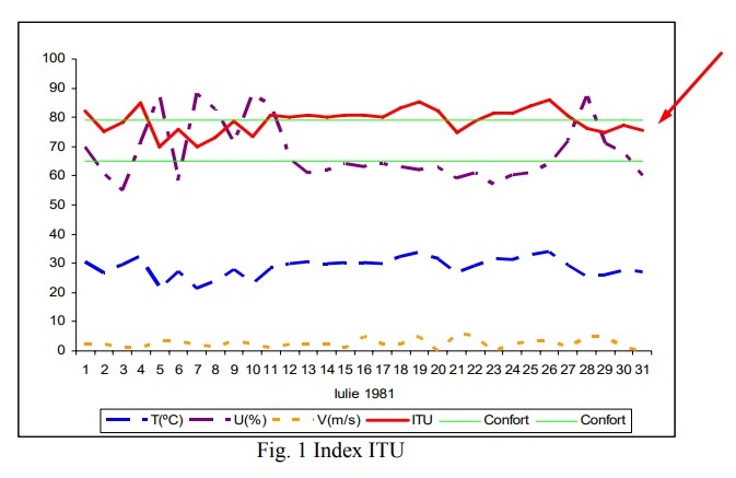 ITU a fost primul indice evaluat, cele două autoare observând din start că „într-o lună normală meteorologic, ITU dă zilnic valori de alertă sau peste pragul critic”. Pentru a vă convinge, reproducem Figura 1 din studiu, în care se vede clar că ITU (linia roșie) este în permanență aproape sau peste „pragul critic” de 80 de unități (cu linie verde).