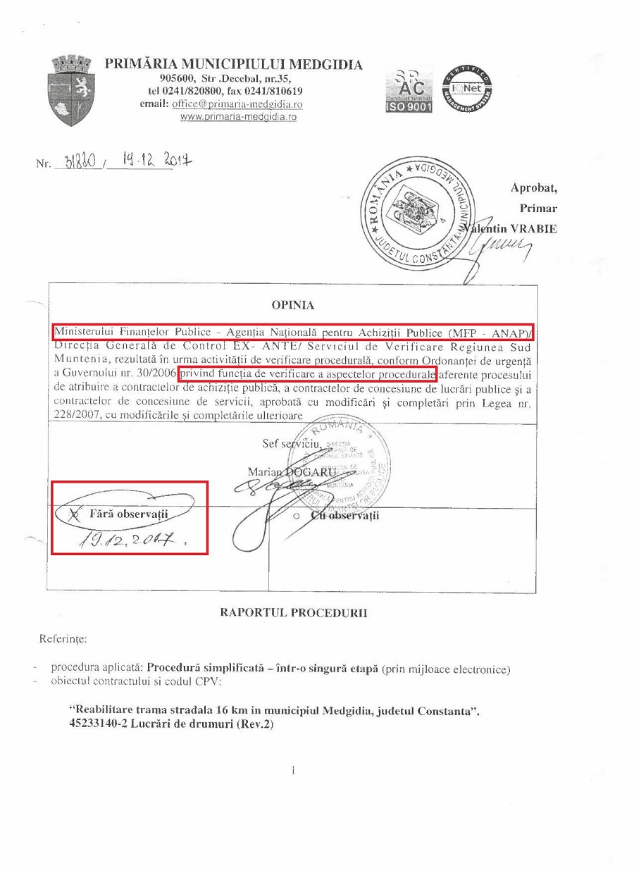 - În urma participării la procedura menționată anterior, observatorii ANAP și-au exprimat punctul de vedere cu privire la desfășurarea etapelor de evaluare și declararea câștigătorului, prin introducerea în raportul final al procedurii nr.31880/19.12.2017 a mențiunii “fără observații cu privire la respectarea aspectelor procedurale”.