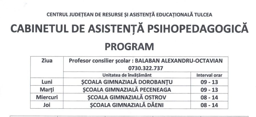 Concret, în fiecare marți, între orele 09:00 – 13:00, Cabinetul de Asistență Psihopedagogică funcționează la Școala Gimnazială Peceneaga.