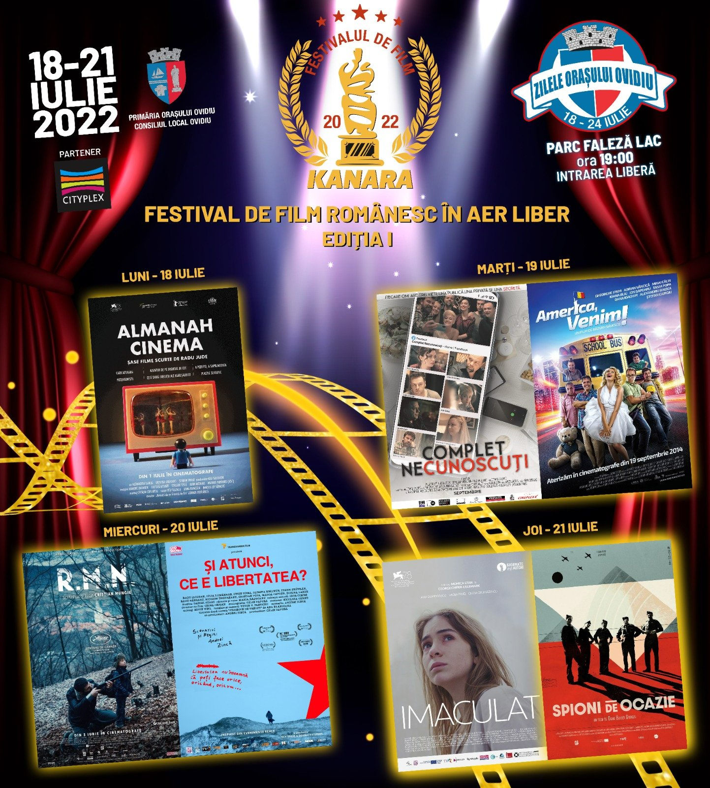 18 – 21 iulie: Festival de film românesc ,,KANARA’’, ediția I (zilnic începând cu ora 19:00, 2 proiecții de filme românești, premiate la festivalurile internaționale, locație Parc Faleză Lac)