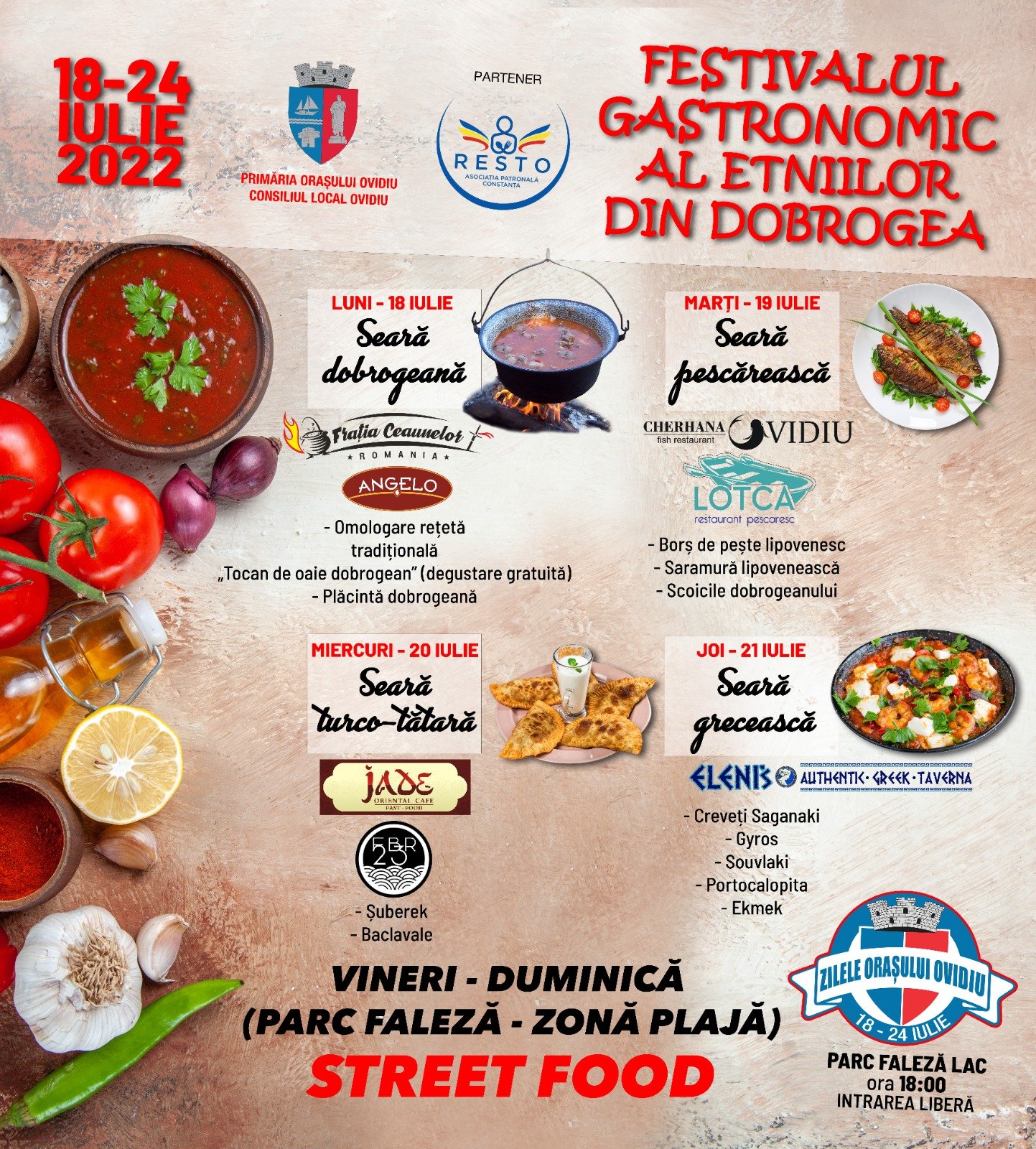 18 – 21 iulie: Festival gastronomic al etniilor din Dobrogea, în parteneriat cu Asociația Patronală RESTO (zilnic, începând cu ora 18:00, degustări gratuite; omologăm rețete autentice în cel mai mare ceaun din România – 2 tone, seară dobrogeană, seară pescărească, seară turco-tătară, seară grecească și alte suprize, locație Parc Zonă Relaxare – plajă)