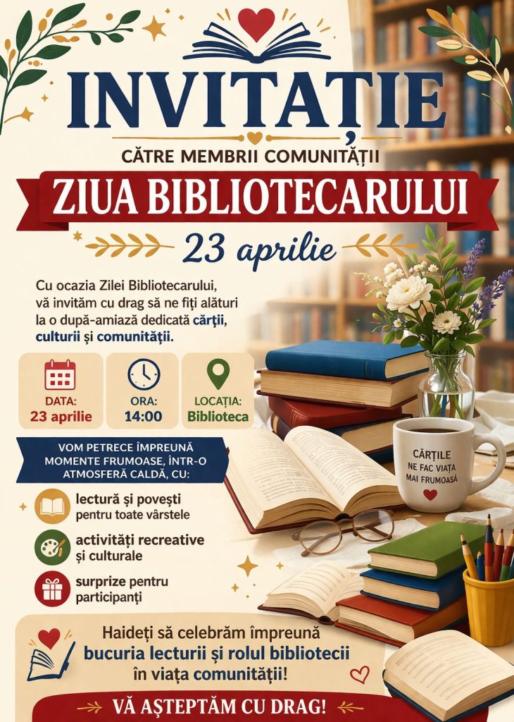La Biblioteca din localitatea Peceneaga, județul Tulcea, se va organiza, cu ocazia Zilei Bibliotecarului, în data de 23 aprilie, începând cu ora 14:00, un eveniment dedicat educației, lecturii și promovării valorilor culturale. Activitatea are ca obiectiv evidențierea rolului bibliotecii în viața comunității și încurajarea participării publicului la activități educative și culturale.