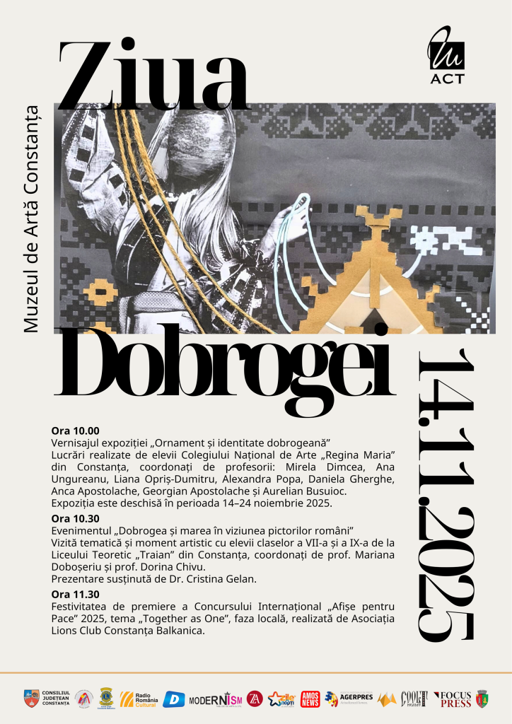Muzeul de Artă Constanța sărbătorește anul acesta Ziua Dobrogei printr-o serie de activități destinate punerii în valoare a specificului spațiului dobrogean. Astfel, în data de 14 noiembrie 2025, începând cu ora 10.00, la sediul Muzeului de Artă Constanța, va avea loc vernisajul expoziției„Ornament și identitate dobrogeană”. Lucrările expoziției sunt semnate de elevi de la Colegiul Național de Arte „Regina Maria” din Constanța, specializările Pictură, Grafică, Modă, Design, Arhitectură și Artă murală, clasele a IX-a, a X-a, a XI-a și a XII-a, coordonate de profesorii Mirela Dimcea, Ana Ungureanu, Liana Opriș-Dumitru, Alexandra Popa, Daniela Gherghe, Anca Apostolache, Georgian Apostolache și Aurelian Busuioc. Executate în diferite tehnici, precum pictură, grafică, modelaj și mixed media, lucrările expoziției pun în valoare simboluri ale spațiului dobrogean. Expoziția va fi deschisă la Muzeul de Artă Constanța, în perioada 14–24 noiembrie 2025, perioadă în care publicul iubitor de artă este invitat să admire lucrările expuse.